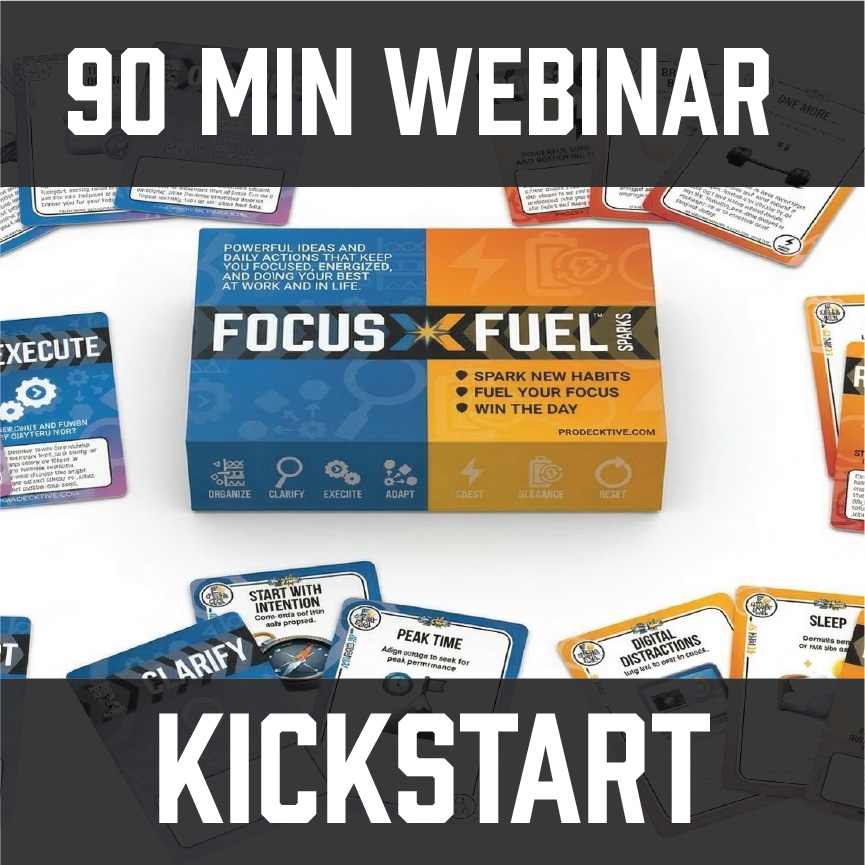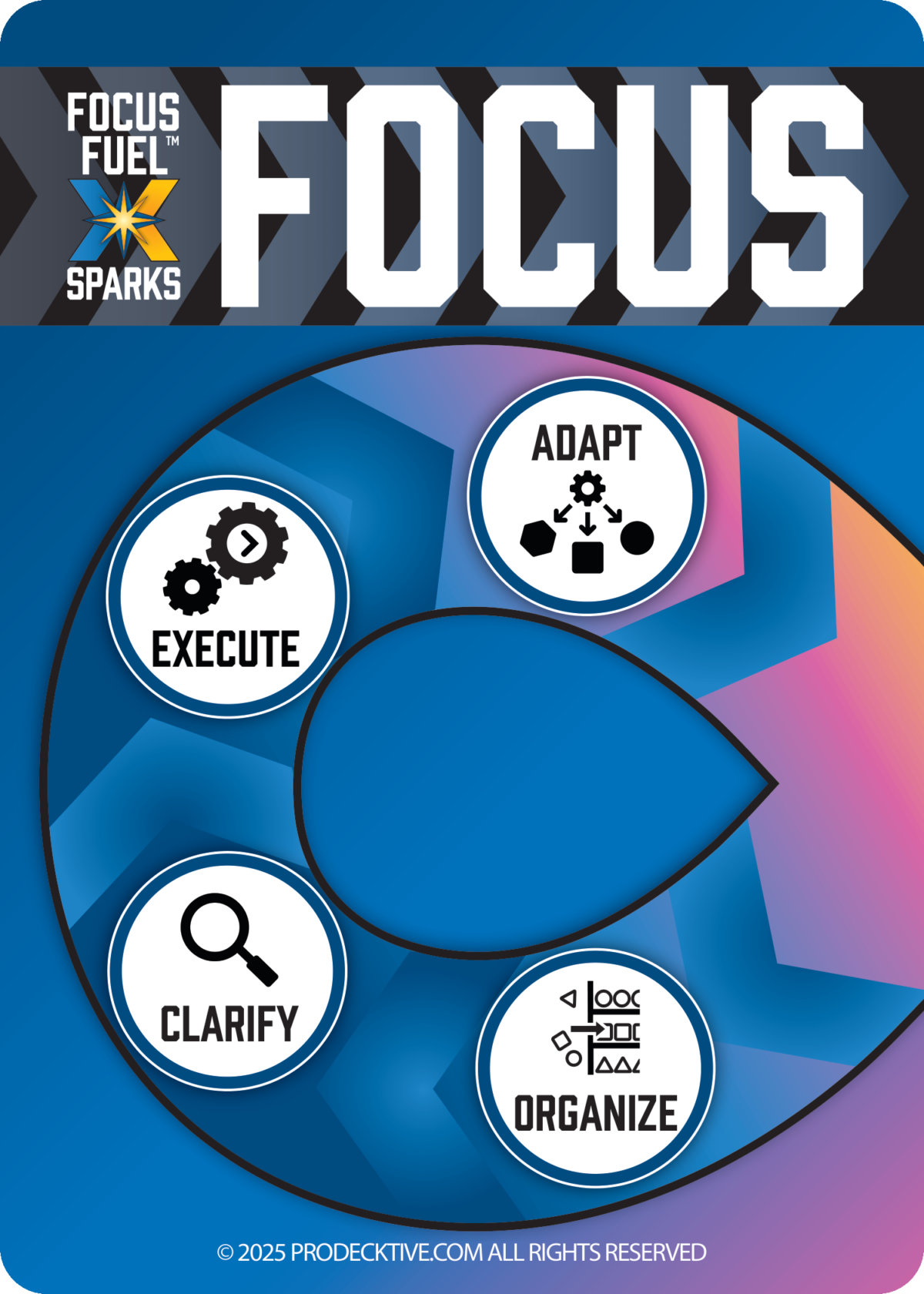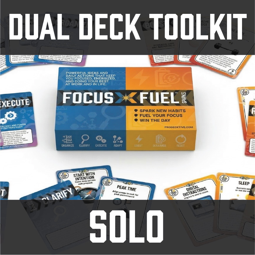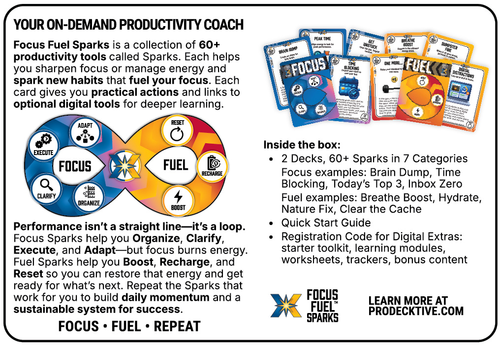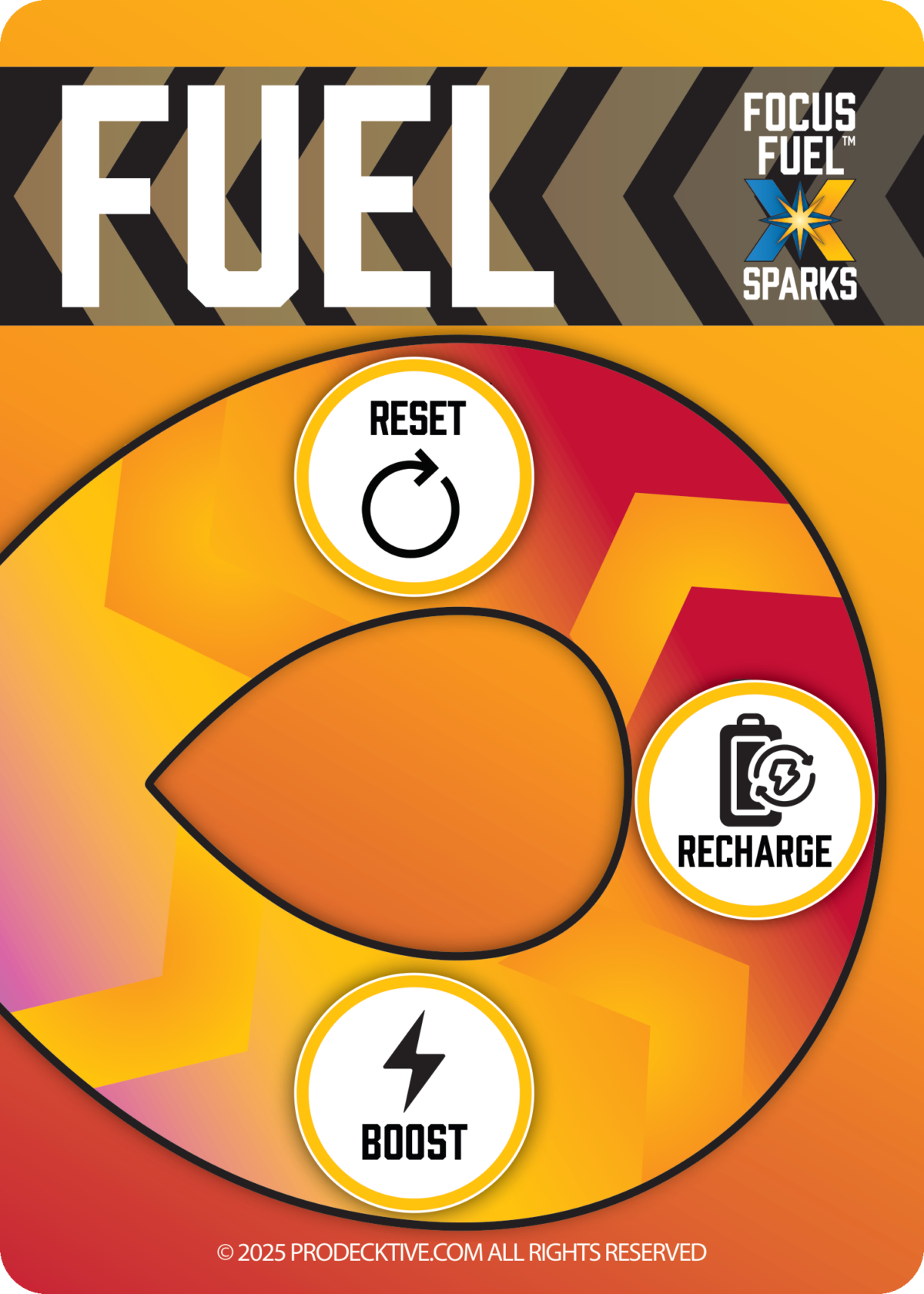 Focus Fuel Sparks is a dual deck system for personal productivity and time management. It helps people sharpen focus, restore energy, and build momentum with 60+ science-backed Sparks across 7 categories. It’s built on one simple truth: focus consumes energy, and fuel restores it. To perform at your best, you must learn to manage both.