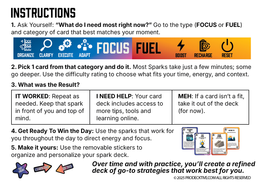 • Focus Fuel Deck — 60+ science-backed Spark strategy cards, plus a reusable sticker sheet and instruction guide