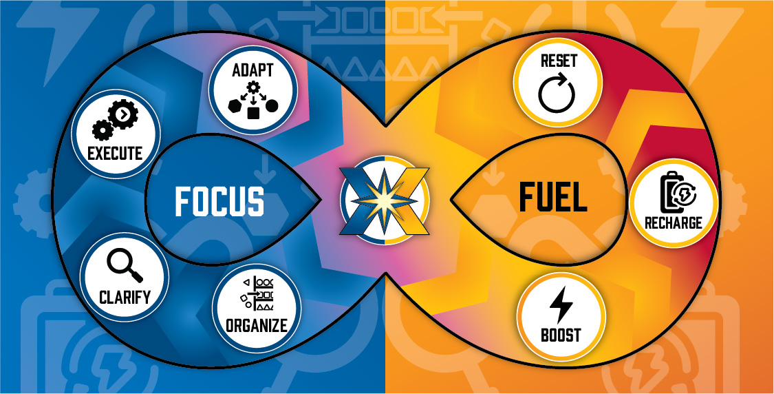 The performance loop shows how your mind and body work: Focus drives action, but it also drains mental and physical energy. Fuel restores what Focus consumes so you can recover, stay in control, and avoid burnout.